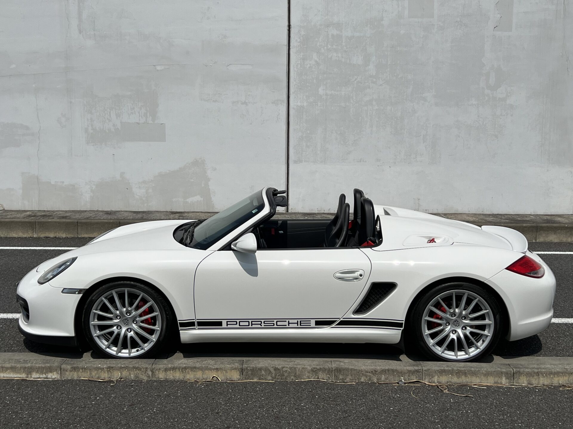 ケイマンRと同様にこの年代の頂点に君臨し、1953年にスポーツカーではなくレーシングカーとして誕生した550Spyderを先代とする特別なモデルです。911のRRとは違い、ミッドシップレイアウトで重量配分されケイマンR同様に徹底的に軽量化を施されました。専用設計されたスポーツサスペンションに軽量アルミ製ドア、インナーハンドルはベルト化されレーシーな雰囲気をかもしだしています。そんな生粋のレーシングカーである550Spyderの魂を受け継ぐ特別な987ボクスタースパイダーの特徴的なリアリッドのシルエットは、カレラGTを彷彿とさせマニアの心を揺さぶるデザインとなっています。簡易的なタープの様な構造でできているソフトトップもこのスパイダーの特徴です。純正ではカーボンバケットシートが装着され無償オプションでスポーツシートに交換できる仕様。同様にエアコンやオーディオもオプション選択というレーシングカーのようなかなり極端なリリースをされました。