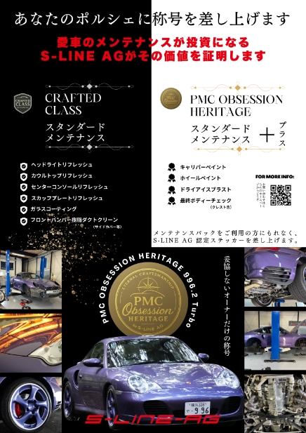 S-LINE AGのメンテナンスは、ポルシェ初期水冷モデルに精通したポルシェマニアの職人たちが、確かな実績と経験であなたの愛車の長寿命化をサポートします。S-LINE AGでご契約いただいたポルシェの納車前点検整備、定期点検、車検整備、一般修理、事故修理、電装品の取り付けまで、オーナー様のポルシェライフをトータルサポートします。